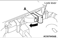 (3)While pushing the part "A" indicated in the figure of the harness side connector, turn the lock lever to the direction of the arrow to release the lock lever, and disconnect the C-121 SRS-ECU connector. (4)Measure the resistance values as shown below.