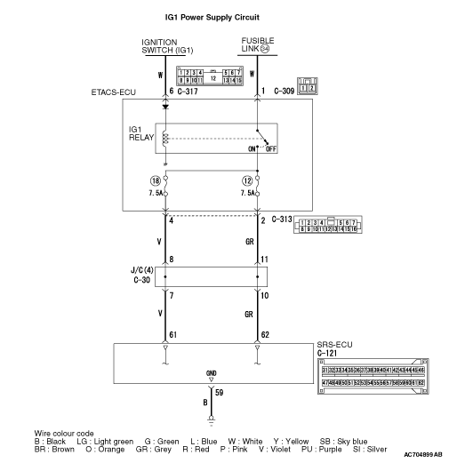 - Continuity between C-313 ETACS-ECU connector terminal No. 2 and C-121 SRS-ECU connector terminal No. 62