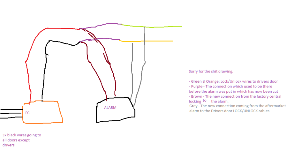 With the drawing, thats the only reason I can come up with as to why the factory central locking will only work on the 3 other doors and not the drivers. I understand they should of just tapped it, but maybe they didnt...