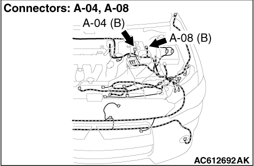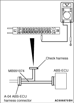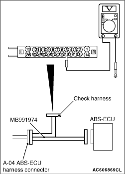 (1)Disconnect the ABS-ECU connector, connect special tool ABS check harness (MB991974) to the harness-side connector, and then measure the voltage at the special tool connector side.