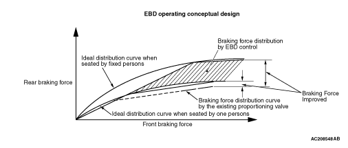 EBD control is activated in a range with lower slip ratio where ABS is disabled. EBD calculates vehicle deceleration and slip amount of the four wheels based on the wheel speed sensor signal. If the rear wheel speed differs from the vehicle speed by a certain level or more, EBD increases, holds, and decreases the pressure at the rear wheel control solenoid valve in the hydraulic unit, and then adjusts rear wheel brake fluid pressure fairly close to an ideal distribution curve.