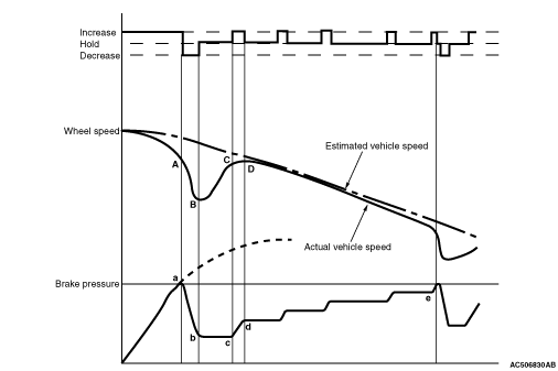5. Brake fluid pressure is controlled by repeating the increase and hold of the pressure. (between d and e)