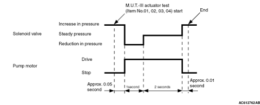 • After the actuator test has been performed, the brake warning lamp and ABS warning lamp illuminate until the ignition switch is turned to ON again or the communication between M.U.T.-III and ABS-ECU is terminated.