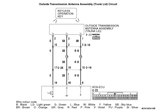 antenna assembly (trunk lid) connector terminal No. 1, 2, 3 and the C-23 KOS-ECU connector terminal